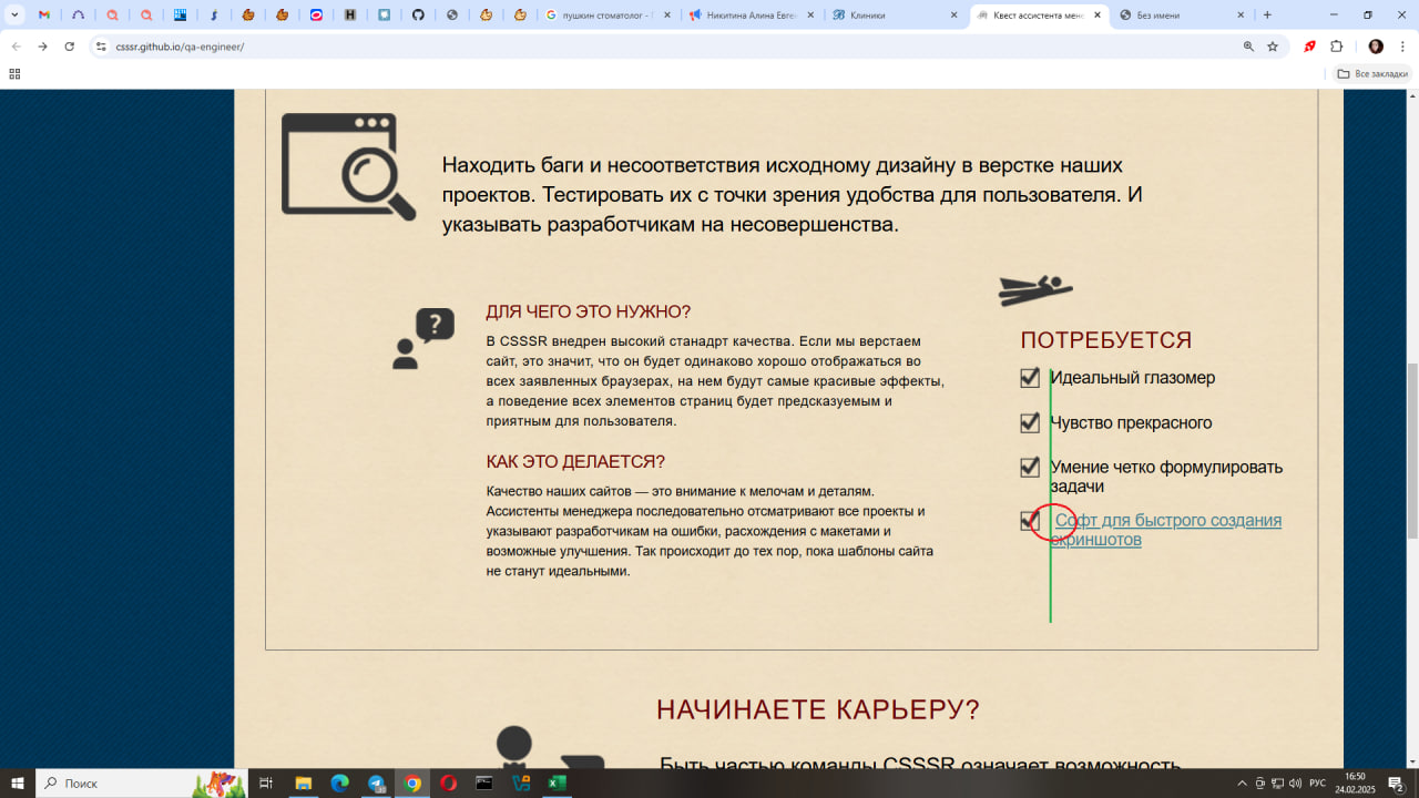 Steps: открыть сайт Ассистент менеджера, зайти во вкладку Находить несовершенства