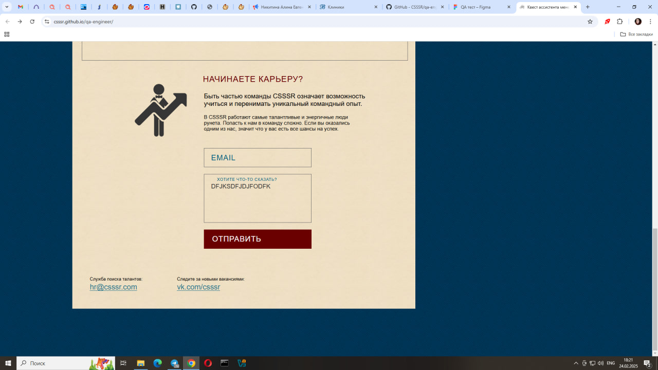 Steps: открыть сайт Ассистент менеджера, скроллить до блока Начинаете карьеру?, ввести текст в поле Хотите что-то сказать?