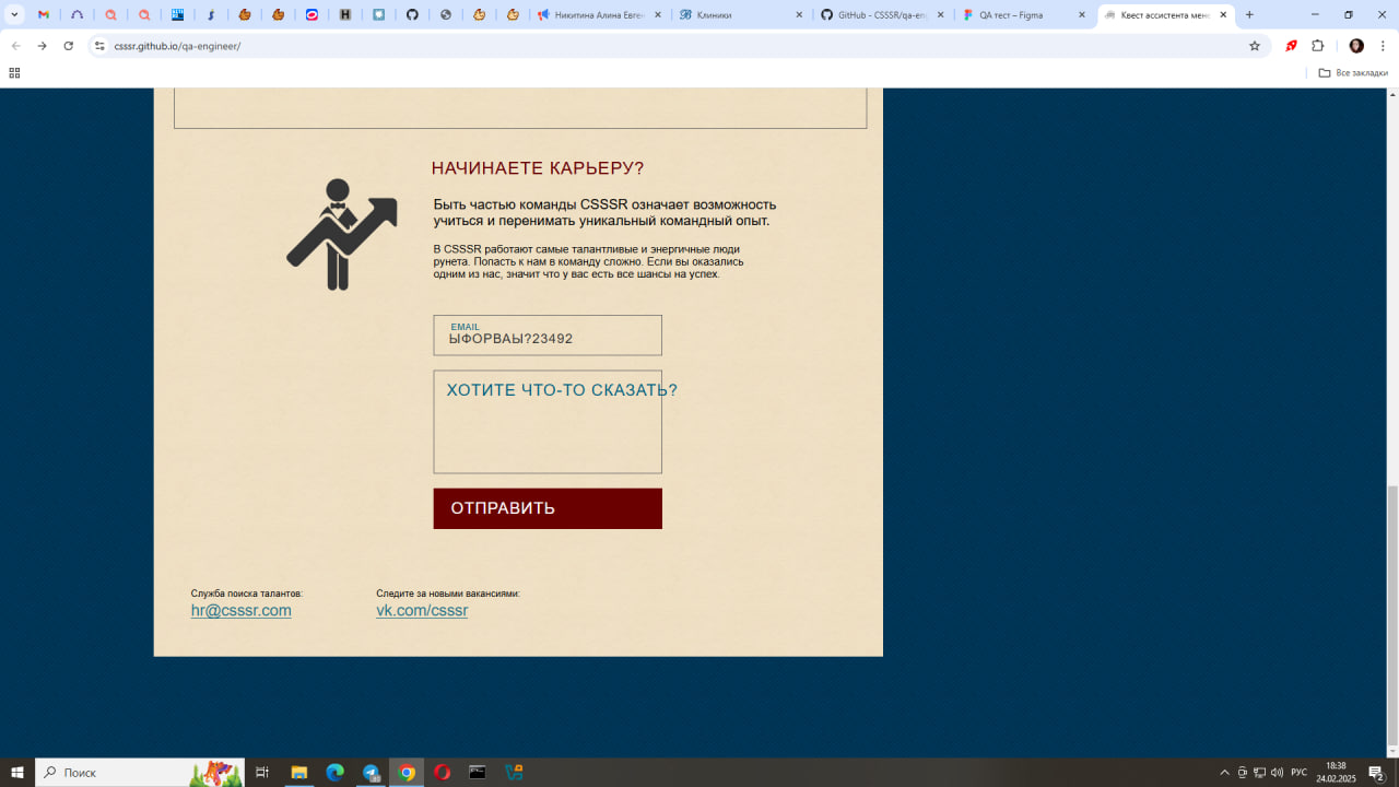 Steps: открыть сайт Ассистент менеджера, скроллить до блока Начинаете карьеру?, ввести некорректный емаил